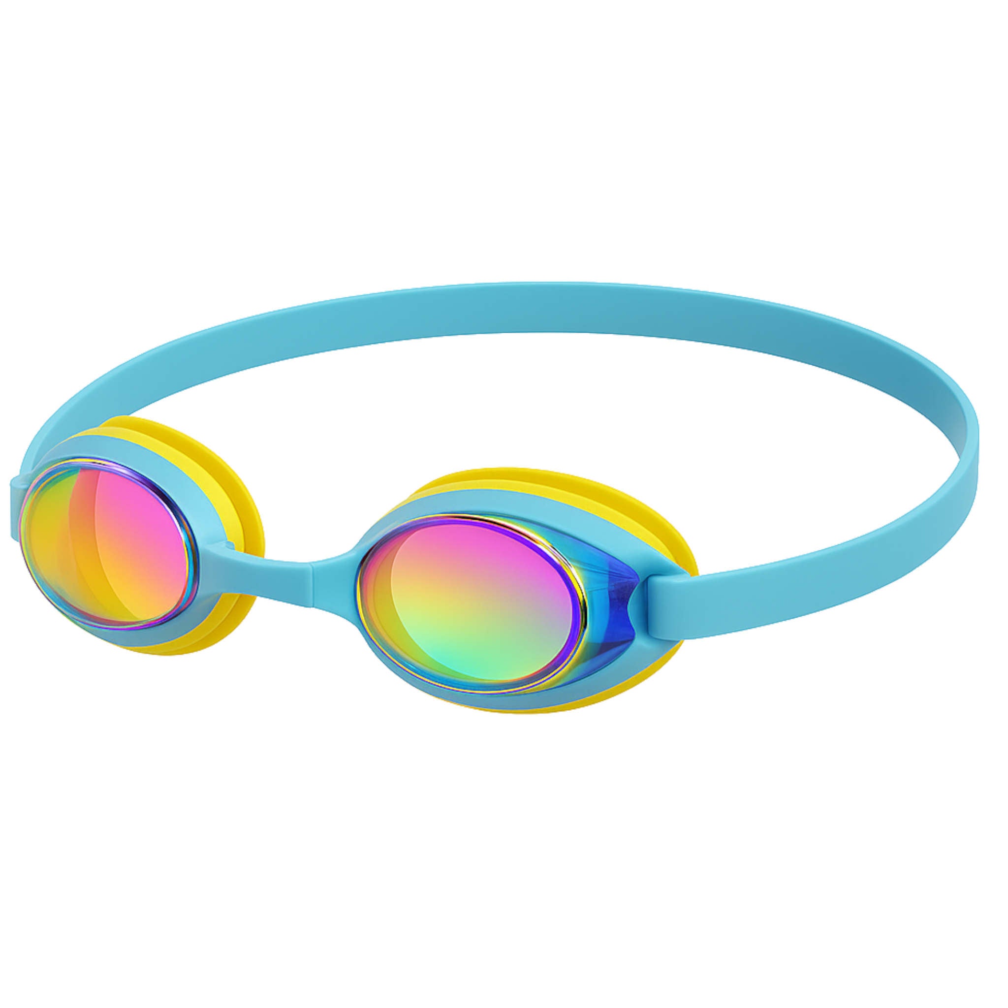 This is an excellent training and racing goggle that fits all swimmers young and old. After years of fixing junior goggles at training we needed to make a goggle that could fit nearly 100% of all young swimmers and have the look of the professional. This is the result. A quality swimming goggle in an Aqua Blue frame / yellow gaskets with rainbow mirrored lens to enjoy indoor and outdoor swimming. Fits all swimmers and but especially great for juniors.
